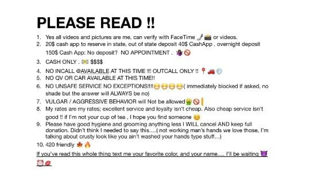 outcall only IM TRAVELING !!!! hi ! Im Kanani; an independent, classy coed available to come to you. No drama, if youre cheap and used to drug addicted girls please know this aint that. if you want a classy, NORMAL, independent , respectful, punctual, flexible chocolate skinned beauty. im your girl ๐๐ PLEASE READ !! Yes all videos and pictures are me, can verify with FaceTime ๐คณ๐พ๐ธ or videos. 20$ cash app to reserve in state, out of state deposit 40$ CashApp , overnight deposit 150$ Cash App: No deposit NO APPOINTMENT . ๐คท๐พโ๐ซ CASH ONLY . ๐ต $$$$ NO INCALL AVAILABLE AT THIS TIME !!! OUTCALL ONLY !! ๐๐๐จ NO QV OR CAR AVAILABLE AT THIS TIME!! NO UNSAFE SERVICE NO EXCEPTIONS!!!!๐ท๐ท๐ท๐ท( immediately blocked if asked, no shade but the answer will ALWAYS be no) VULGAR / AGGRESSIVE BEHAVIOR will Not be allowed๐คฎ๐ซ My rates are my rates; excellent service and loyalty isnโt cheap. Also cheap service isnโt good !! if Iโm not your cup of tea , I hope you find someone โบ Please have good hygiene and grooming anything less I WILL cancel AND keep full donation. Didnโt think I needed to say thisโฆ.( not working manโs hands we love those, Iโm talking about crusty look like you ainโt washed your hands type stuffโฆ) 420 friendly ๐๐ฅ If youโve read this whole thing text me your favorite color, and your nameโฆ. Iโll be waiting ๐โฐ๐